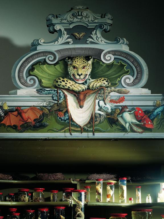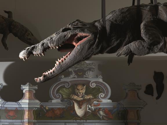 Folgen Sie dem Krokodil und starten Sie Ihren Rundgang in der Sammlung der Naturalia im Süden des Raumes. Für Ihren Rundgang orientieren Sie sich an dem abgebildeten Foto mit dem Bekrönungsmotiv bzw. einem Sammlungsdetail oder an den Nummern der Schränke in römischen Ziffern direkt unter der Bekrönungsmalerei.