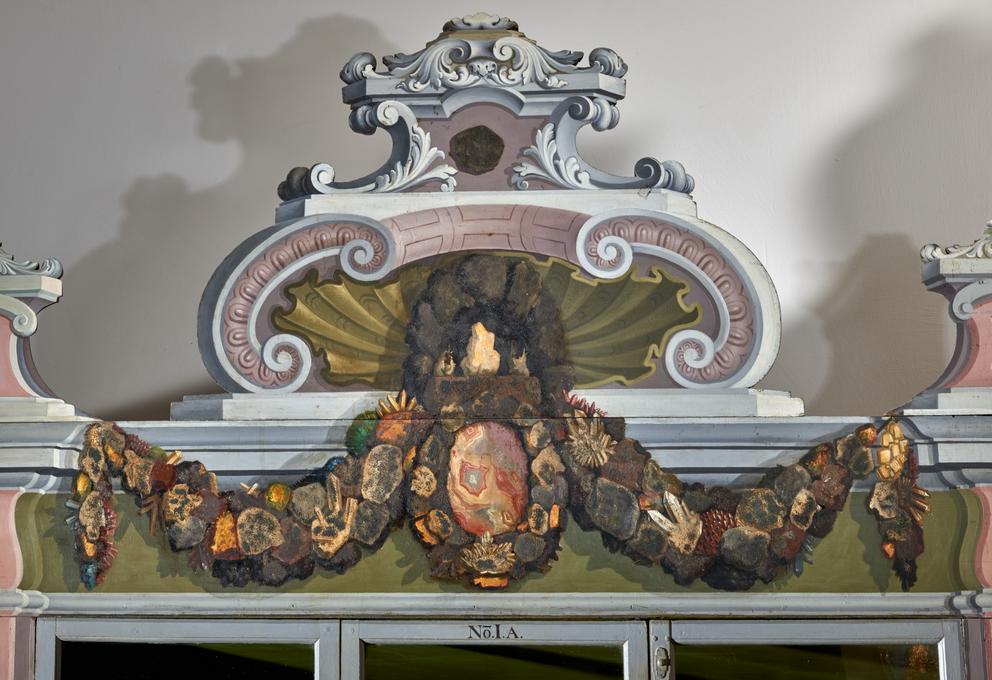 Kleine Mineralien- und Gesteinssplitter lassen das Bekrönungsmotiv des Gesteinsschrankes mehrdimensional erscheinen und im Licht leuchten.